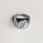 Silver signet ring with heart dagger engraving and smiley/sad faces on the sides