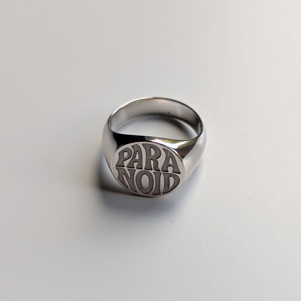 Round shaped solid 925 sterling Silver signet ring with engraving. Inspired by local legend Ozzy Osbourne of Black Sabbath and their second studio album Paranoid. Perfect gift for all the Heavy Metal heads.