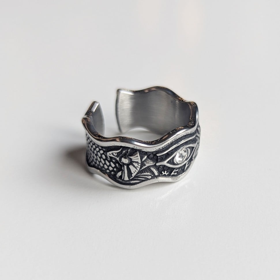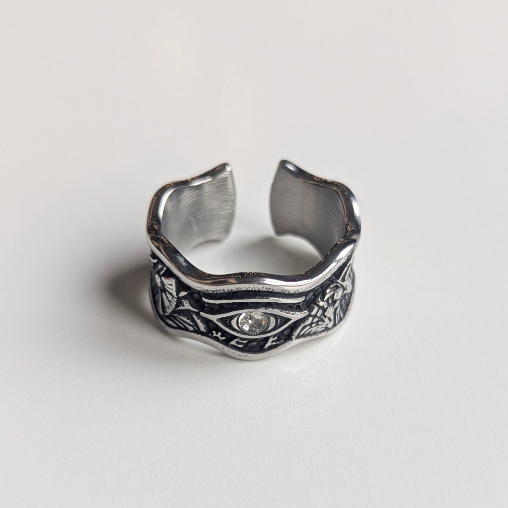 Silver band ring with eye detail and Egyptian imagery