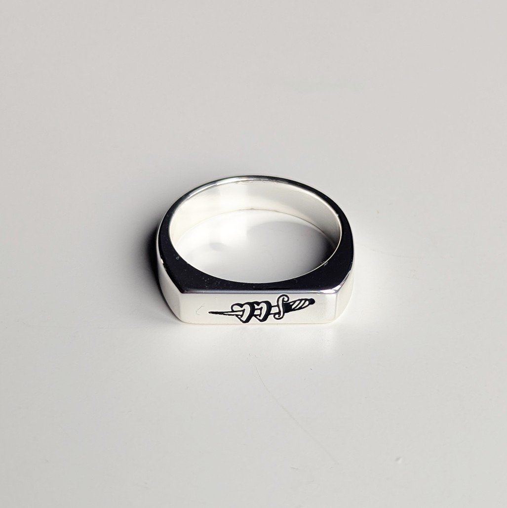 Silver ring with hearts and dagger engraving